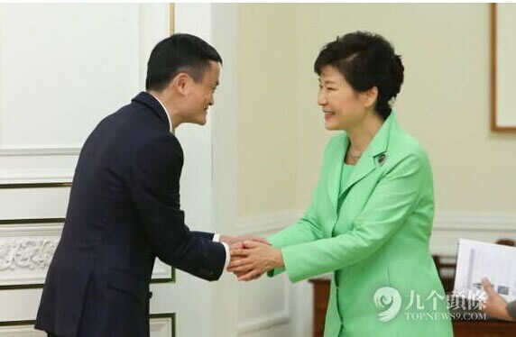 8月18日,韩国总统朴槿惠在青瓦台总统府会见了到访的中国阿里巴巴集团创始人、董事局主席马云,双方就中韩两国在提高电子交易系统及物流效率以及教育、产品认证服务等领域展开合作达成共识。